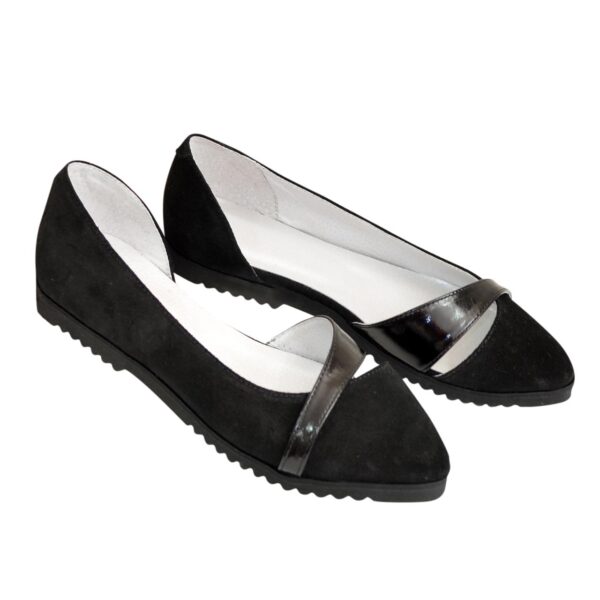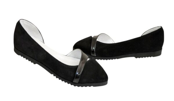 Витончені балетки з натуральної замші чорного кольору, на тонкій підошві із загостреним носком. Відповідають стандартній розмірній сітці. Розраховані на стандартну повноту стегна. Можливий відшив у шкірі, замші різних кольорів.