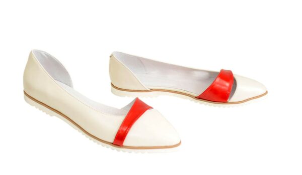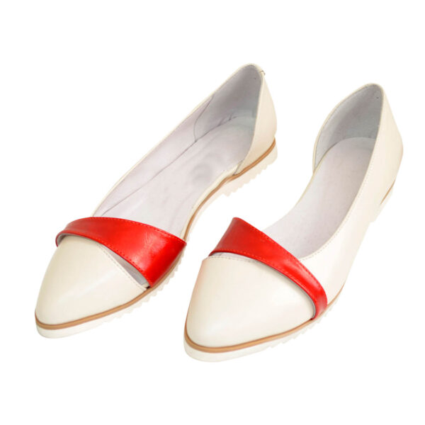 Витончені балетки з натуральної шкіри бежевого та червоного кольору, на тонкій білій підошві із загостреним носком. Відповідають стандартній розмірній сітці. Розраховані на стандартну повноту стегна. Можливий відшив у шкірі, замші різних кольорів.