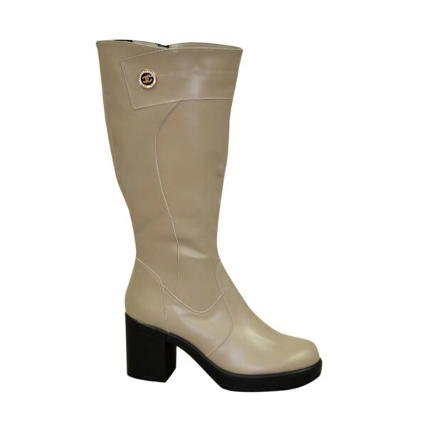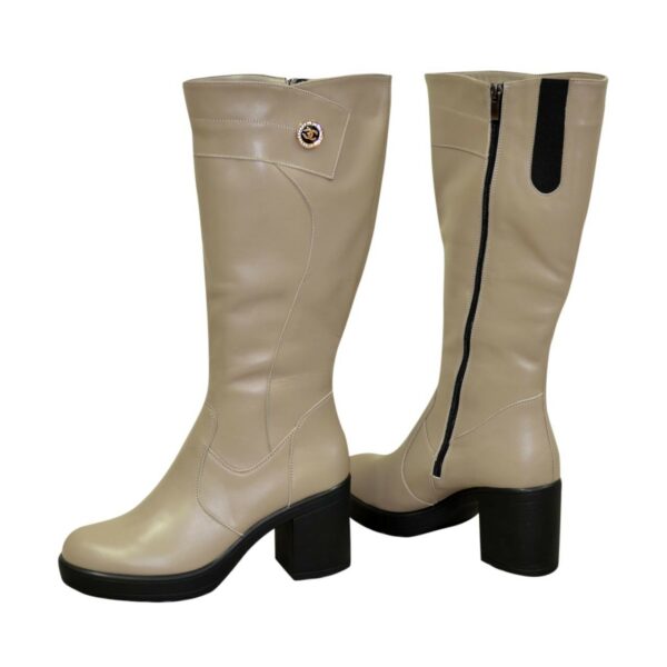 Жіночі чоботи з широкою халявою батали з натуральної шкіри кольору візон, з гумкою у верхній частині чобота. Декоровані фурнітурою. На стійкому підборі. Обсяг гомілки можна замовити від 34 см до 45 см для будь-якого розміру.