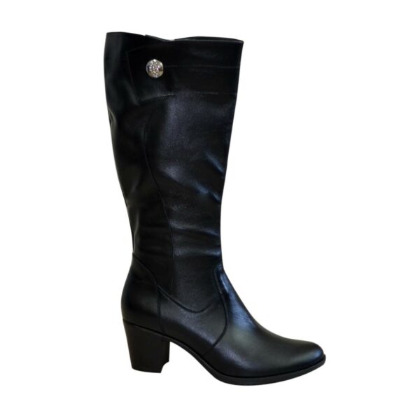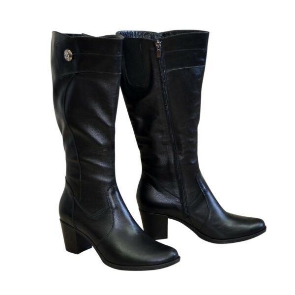 Жіночі чоботи з широкою халявою батали з натуральної шкіри чорного кольору, з гумкою у верхній частині чобота. Декоровані фурнітурою. На стійкому підборі. Обсяг гомілки можна замовити від 34 см до 45 см для будь-якого розміру.