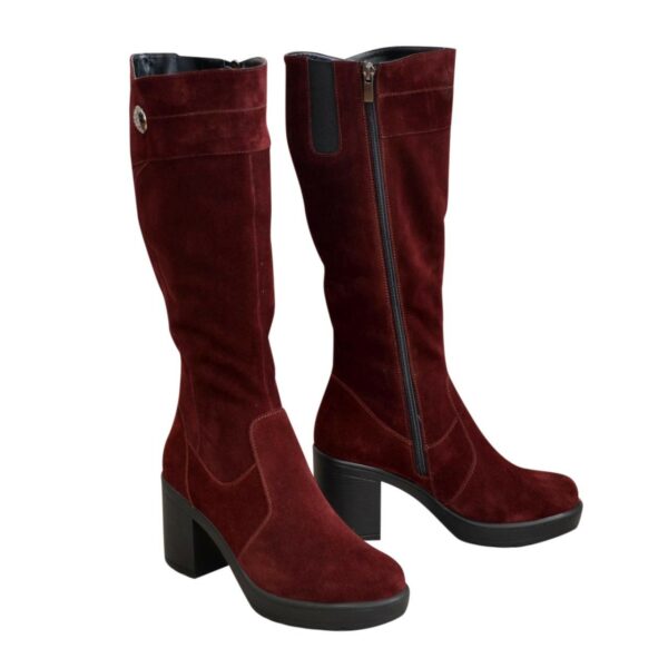 Жіночі чоботи з широкою халявою батали з натуральної замші бордового кольору, з гумкою у верхній частині чобота. Декоровані фурнітурою. На стійкому підборі. Обсяг гомілки можна замовити від 34 см до 45 см для будь-якого розміру.