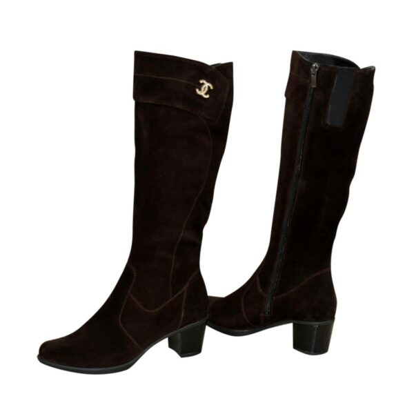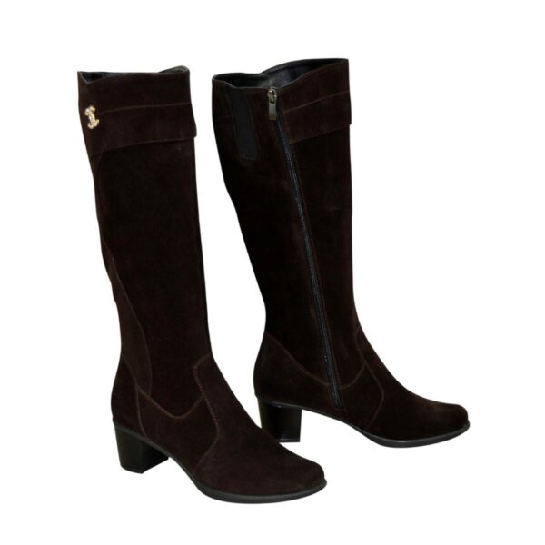 Жіночі чоботи з широкою халявою батали з натуральної замші коричневого кольору, з гумкою у верхній частині чобота. Декоровані фурнітурою. На стійкому підборі. Обсяг гомілки можна замовити від 34 см до 45 см для будь-якого розміру.