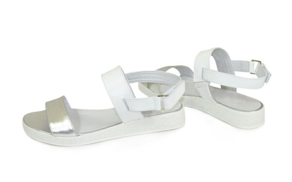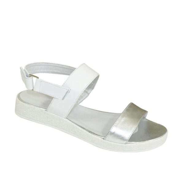 Дуже зручні жіночі босоніжки з натуральної шкіри білого та сріблястого кольору, на потовщеній підошві. Завдяки додатковій фіксації гомілкостопу їх зручно носити. Устілка обтягнута шкірою. Повномірні відповідають стандартній сітці розміру. Можливий відшив у шкірі, замші різних кольорів.