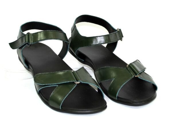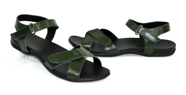 Легкі літні босоніжки на литій ортопедичній підошві, з натуральної шкіри зеленого кольору, із застібкою, що регулює підйом. Завдяки додатковій фіксації гомілкостопу їх зручно носити та долати в них тривалі дистанції. Повномірні відповідають стандартній сітці розміру. Можливий відшив у шкірі, замші різних кольорів.