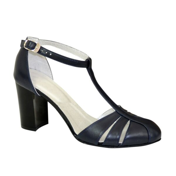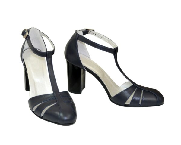 Зручні стильні, жіночі босоніжки із задником на стійкому підборі висотою 8.5 см. із натуральної шкіри синього кольору, завдяки додатковій фіксації гомілкостопу їх зручно носити. Повномірні відповідають стандартній сітці розміру. Можливий відшив у шкірі, замші різних кольорів.