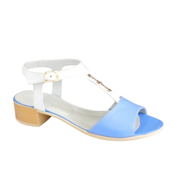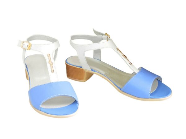 Дуже зручні жіночі босоніжки з натуральної шкіри білого та блакитного кольору, на маленькому підборі 3.5 см. Завдяки додатковій фіксації гомілкостопу їх зручно носити. Повномірні відповідають стандартній сітці розміру. Можливий відшив у шкірі, замші різних кольорів.