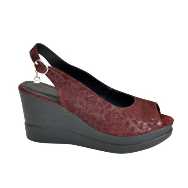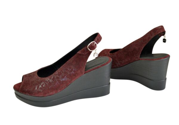 Зручні стильні жіночі босоніжки на стійкій платформі. Висота платформи 9 см, попереду 3 см. з натуральної замші з лазерним напиленням бордового кольору, завдяки додатковій фіксації гомілкостопа їх зручно носити. Повномірні відповідають стандартній сітці розміру. Можливий відшив у шкірі, замші різних кольорів.