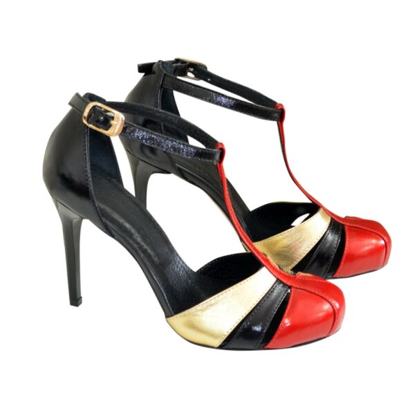 Ошатні стильні, жіночі босоніжки із задником на шпильці висотою 9.5 см. з натуральної лакової шкіри чорного червоного та золотого кольору, завдяки додатковій фіксації гомілкостопу їх зручно носити. Повномірні відповідають стандартній сітці розміру. Можливий відшив у шкірі, замші різних кольорів.