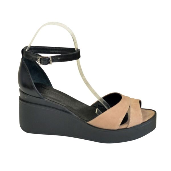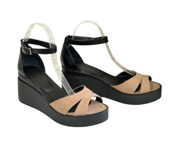 Зручні, жіночі босоніжки із задником на стійкій танкетці, висота платформи 7,5 см., попереду 2,5 см із натуральної шкіри та нубуку колір чорний+беж, завдяки додатковій фіксації гомілкостопу їх зручно носити. Повномірні відповідають стандартній розмірній сітці. М'яка устілка обтягнута світлою шкірою. Можливий відшив у шкірі, замші різних кольорів.