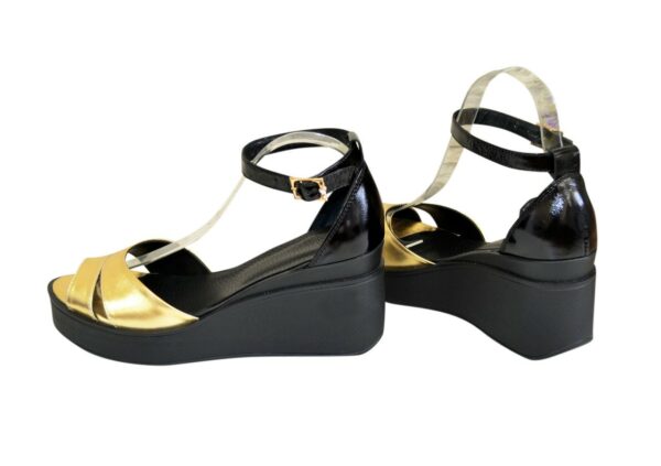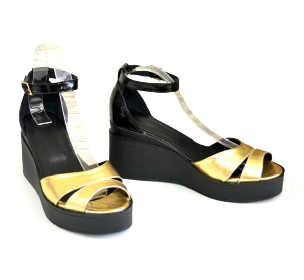 Зручні, жіночі босоніжки із задником на стійкій танкетці, висота платформи 7,5 см., попереду 2,5 см із натуральної лакової шкіри чорного кольору та шкіри золотого кольору, завдяки додатковій фіксації гомілкостопу їх зручно носити. Повномірні відповідають стандартній розмірній сітці. М'яка устілка обтягнута світлою шкірою. Можливий відшив у шкірі, замші різних кольорів.