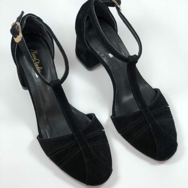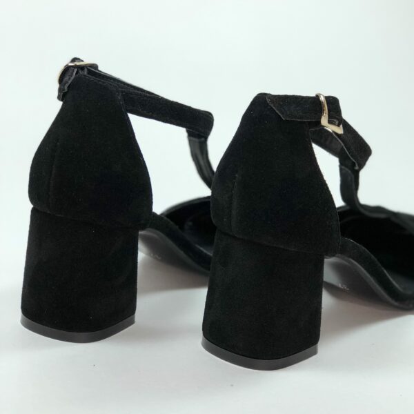 Стильні, жіночі босоніжки із задником, із чорної замші на стійкому обтягнутому шкірою підборі 6.5 см. , завдяки додатковій фіксації гомілкостопу вдовні в носінні. Повномірні відповідають стандартній сітці розміру. Можливий відшив у шкірі, замші різних кольорів.