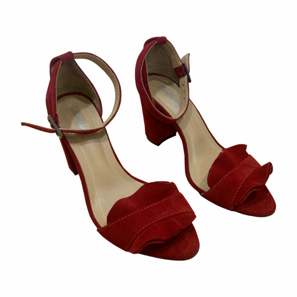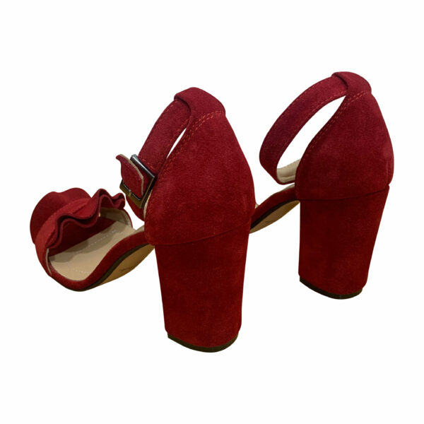 Молодіжні жіночі босоніжки на високому обтягнутому стійкому каблуці 8.5 см. Виконані з натуральної замші червоного кольору. Ручної роботи з використанням виключно натуральних матеріалів високої якості. Відповідають стандартній розмірній сітці. Розраховані на стандартну повноту стегна. Можливий відшив у шкірі, замші різних кольорів.