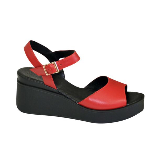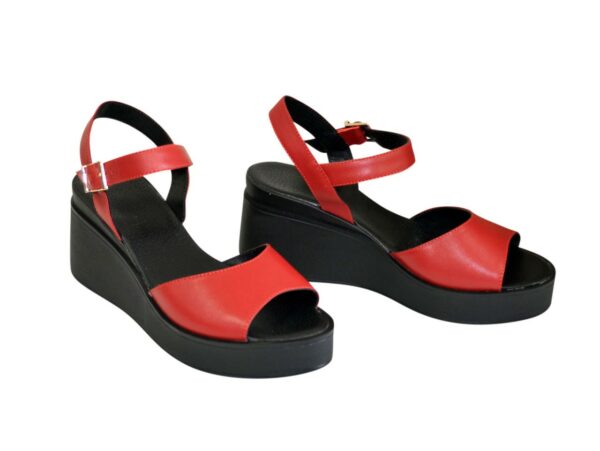 Жіночі молодіжні босоніжки на стійкій танкетці, висота платформи 7,5 см, попереду 2,5 см з натуральної шкіри червоного кольору, повномірні відповідають стандартній сітці розміру. М'яка устілка обтягнута світлою шкірою. Можливий відшив у шкірі, замші різних кольорів.