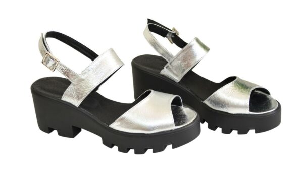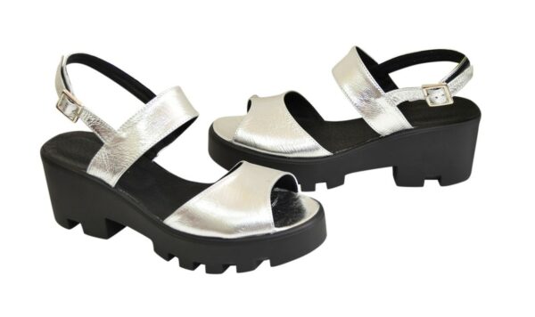 Стильні жіночі босоніжки із натуральної срібної шкіри на тракторній танкетці. Висота платформи 5,5 см, підошви – 3 см . повномірні відповідають стандартній розмірній сітці. Устілка обтягнута світлою шкірою. Можливий відшив у шкірі, замші різних кольорів.