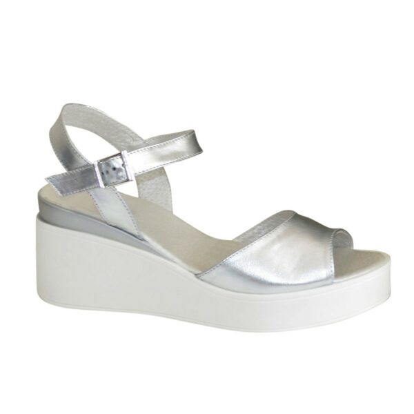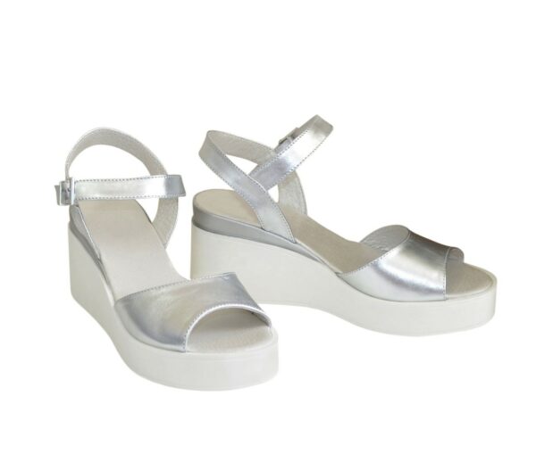 Зручні, жіночі босоніжки на стійкій танкетці, висота платформи 7,5 см, попереду 2,5 см з натуральної шкіри срібного кольору, повномірні відповідають стандартній розмірній сітці. М'яка устілка обтягнута світлою шкірою. Можливий відшив у шкірі, замші різних кольорів.