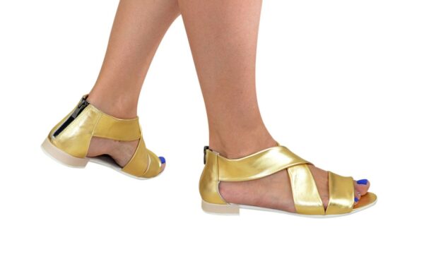 Стильні жіночі босоніжки римлянки з натуральної шкіри золотого кольору, на низькому ходу, з блискавкою. Завдяки додатковій фіксації гомілкостопу їх зручно носити та долати в них тривалі дистанції. Повномірні відповідають стандартній сітці розміру. Можливий відшив у шкірі, замші різних кольорів.