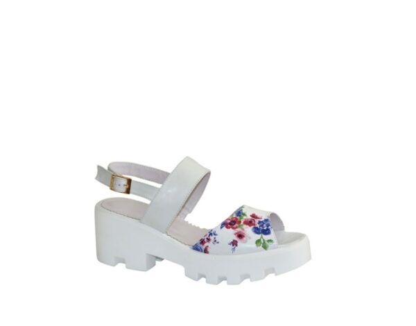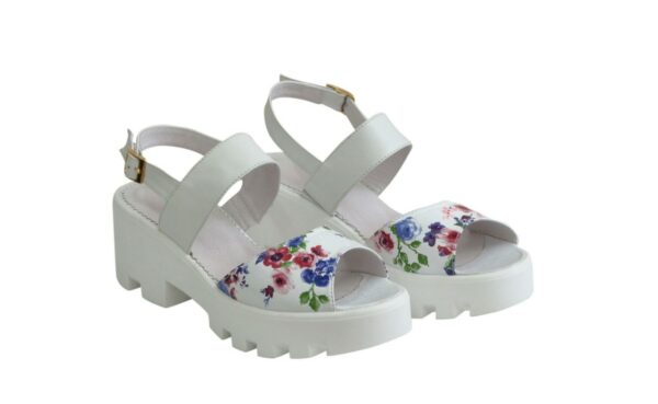 Зручні, молодіжні босоніжки на тракторній танкетці. Висота платформи 6,5 див, попереду 3,5 див. з натуральної білої шкіри із квітами, повномірні відповідають стандартній розмірній сітці. Можливий відшив у шкірі, замші різних кольорів.