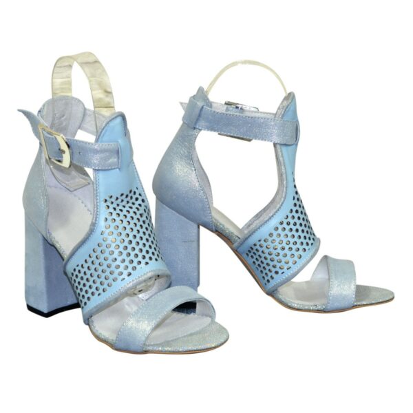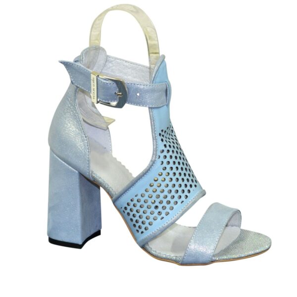 Ошатні зручні жіночі босоніжки на стійкому обтягнутому підборі 9.5 см. підошва блок шкіряний . Зі натуральної шкіри блакитного кольору з перфорацією. Завдяки додатковій фіксації гомілкостопу їх зручно носити. Повномірні, розраховані на стандартну повноту стегна. Відповідають стандартній розмірній сітці. Можливий відшив у шкірі, замші різних кольорів.