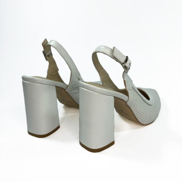 Витончені жіночі босоніжки-туфлі з гострим носком на обтяжному підборі 9.5 см. підошва блокова. Зі натуральної шкіри білого кольору. Повномірні, розраховані на стандартну повноту стегна. Відповідають стандартній розмірній сітці. Можливий відшив у шкірі, замші різних кольорів.