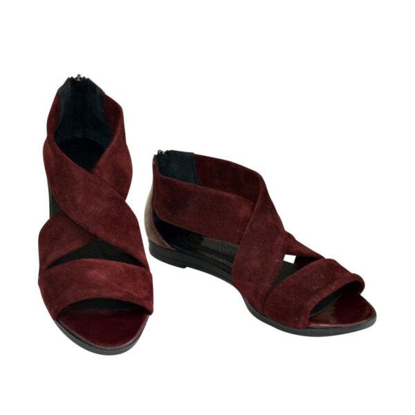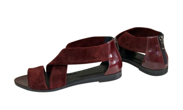 Стильні жіночі босоніжки римлянки з натуральної шкіри і замші бордового кольору, на низькому ходу, з блискавкою. Завдяки додатковій фіксації гомілкостопу їх зручно носити та долати в них тривалі дистанції. Повномірні відповідають стандартній сітці розміру. Можливий відшив у шкірі, замші різних кольорів.