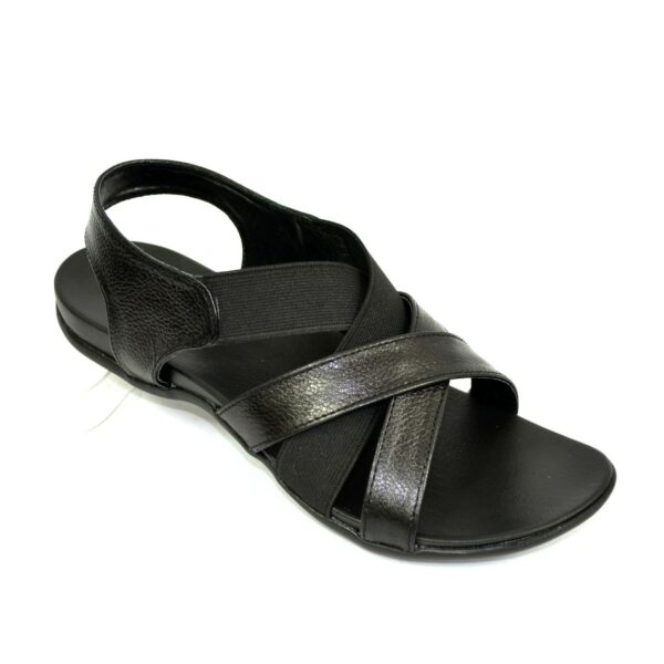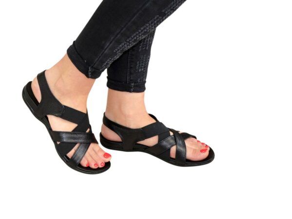 Легкі повсякденні босоніжки на литій ортопедичній підошві, з натуральної шкіри чорного кольору, з гумкою, що регулює підйом. Завдяки додатковій фіксації гомілкостопу їх зручно носити та долати в них тривалі дистанції. Повномірні відповідають стандартній сітці розміру. Можливий відшив у шкірі, замші різних кольорів.