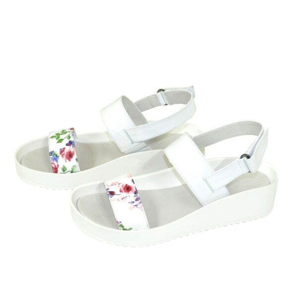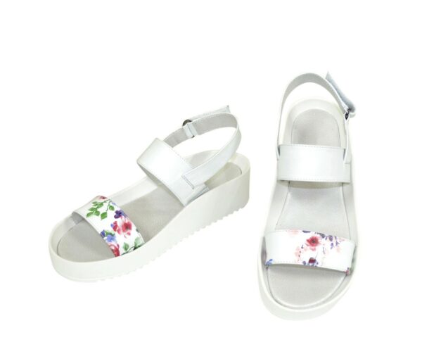 Дуже зручні жіночі босоніжки з натуральної шкіри, колір білий+квіти, на потовщеній підошві. Завдяки додатковій фіксації гомілкостопу їх зручно носити. Устілка обтягнута шкірою. Повномірні відповідають стандартній сітці розміру. Можливий відшив у шкірі, замші різних кольорів.