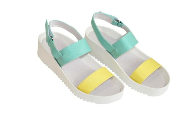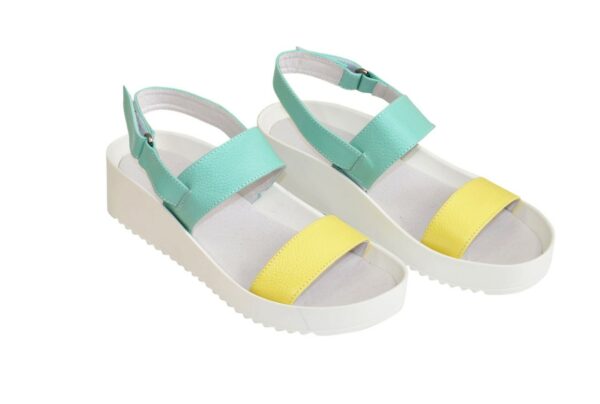 Дуже зручні жіночі босоніжки з натуральної шкіри м'ятного та жовтого кольору, на потовщеній підошві. Завдяки додатковій фіксації гомілкостопу їх зручно носити. Устілка обтягнута шкірою. Повномірні відповідають стандартній сітці розміру. Можливий відшив у шкірі, замші різних кольорів.