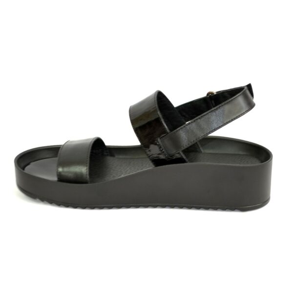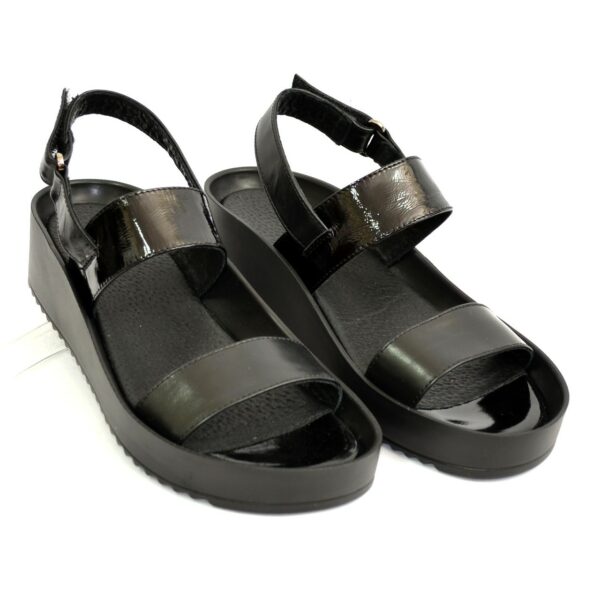 Дуже зручні жіночі босоніжки з натуральної лакової шкіри чорного кольору на потовщеній підошві. Завдяки додатковій фіксації гомілкостопу їх зручно носити. Устілка обтягнута шкірою. Повномірні відповідають стандартній сітці розміру. Можливий відшив у шкірі, замші різних кольорів.