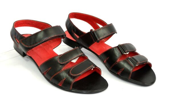 Легкі літні босоніжки на маленькому каблучці, з натуральної шкіри чорного кольору, із застібкою, що регулює підйом. Завдяки додатковій фіксації гомілкостопу їх зручно носити та долати в них тривалі дистанції. Повномірні відповідають стандартній сітці розміру. Можливий відшив у шкірі, замші різних