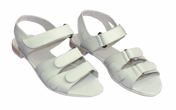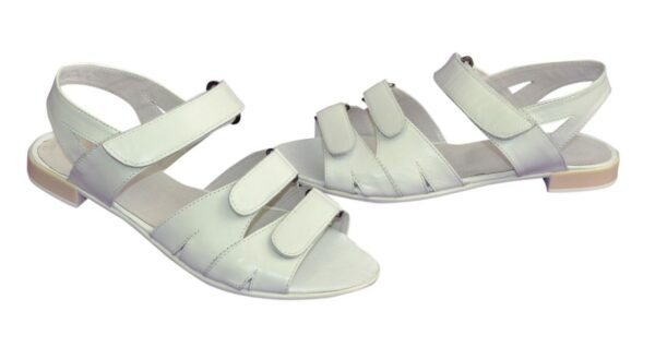 Легкі літні босоніжки на маленькому каблучці, з натуральної шкіри білого кольору, із застібкою, що регулює підйом. Завдяки додатковій фіксації гомілкостопу їх зручно носити та долати в них тривалі дистанції. Повномірні відповідають стандартній сітці розміру. Можливий відшив у шкірі, замші різних