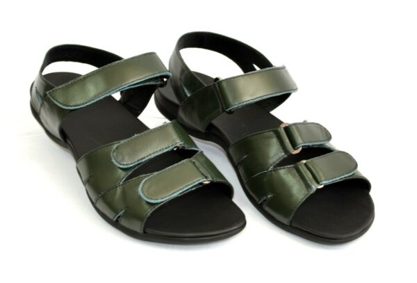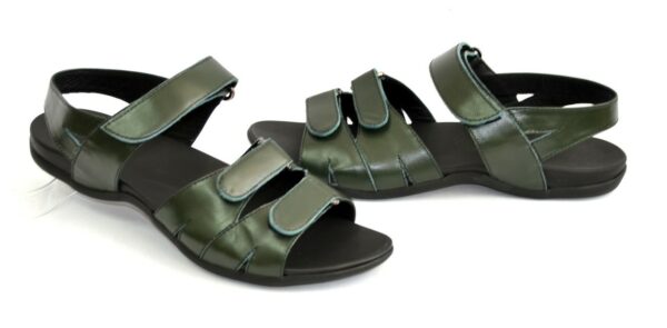 Легкі літні босоніжки на литій ортопедичній підошві, з натуральної шкіри зеленого кольору, із застібкою, що регулює підйом. Завдяки додатковій фіксації гомілкостопу їх зручно носити та долати в них тривалі дистанції. Повномірні відповідають стандартній сітці розміру. Можливий відшив у шкірі, замші різних кольорів.
