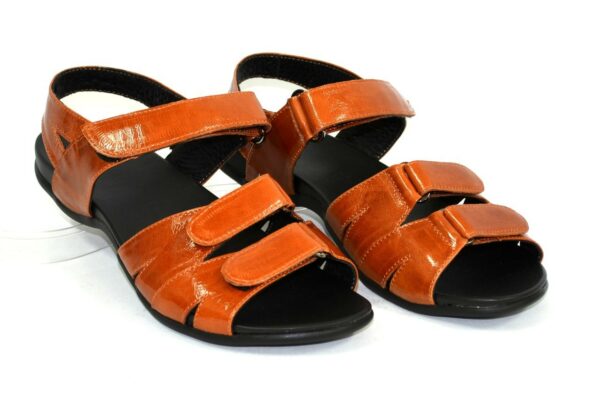 Легкі літні босоніжки на литій ортопедичній підошві, з натуральної шкіри рудого кольору, із застібкою, що регулює підйом. Завдяки додатковій фіксації гомілкостопу їх зручно носити та долати в них тривалі дистанції. Повномірні відповідають стандартній сітці розміру. Можливий відшив у шкірі, замші різних кольорів.