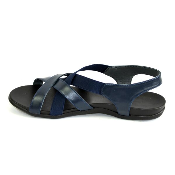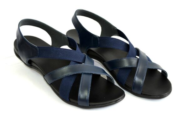Легкі повсякденні босоніжки на литій ортопедичній підошві, з натуральної шкіри синього кольору, з гумкою, що регулює підйом. Завдяки додатковій фіксації гомілкостопу їх зручно носити та долати в них тривалі дистанції. Повномірні відповідають стандартній сітці розміру. Можливий відшив у шкірі, замші різних кольорів.