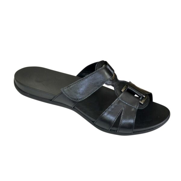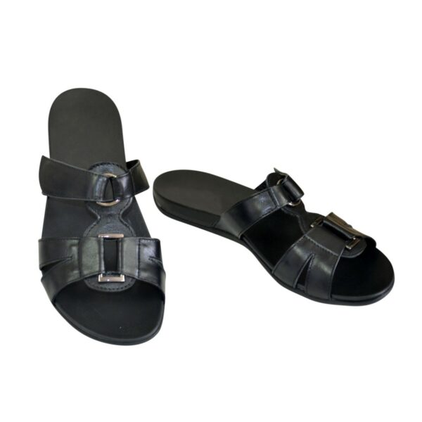 Зручні шльопанці на легкій поліуретановій підошві, з натуральної шкіри чорного кольору, повномірні відповідають стандартній сітці. Підйом регулюється липучкою, підійде на повну ногу. Можливий відшив у шкірі, замші різних кольорів.