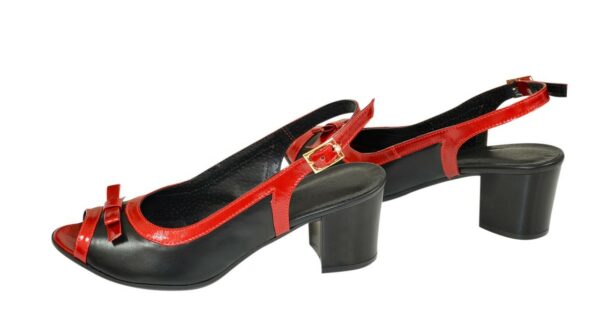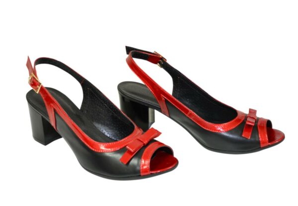 Елегантні жіночі босоніжки, з натуральної чорної та червоної лакової шкіри, з декорацією з банта, на стійкому лаковому підборі 5.5 см. Завдяки додатковій фіксації гомілкостопу їх зручно носити та долати в них тривалі дистанції. Повномірні відповідають стандартній сітці розміру. Можливий відшив у шкірі, замші різних кольорів.