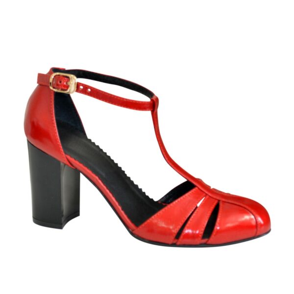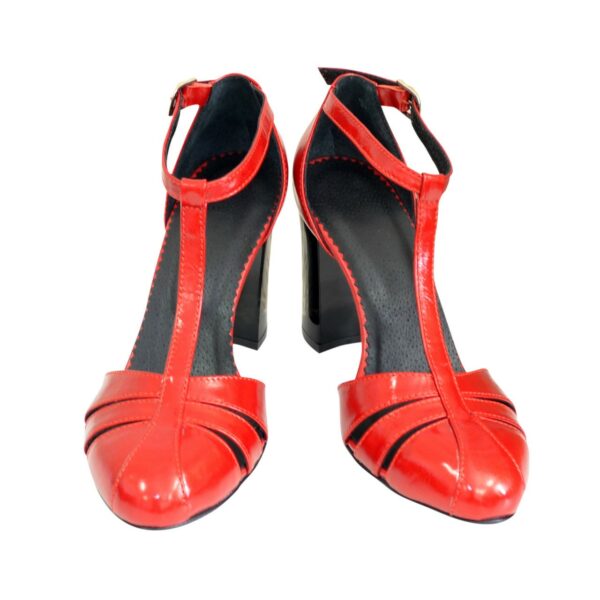 Яскраві стильні, жіночі босоніжки із задником на стійкому підборі висотою 8.5 см. з натуральної лакової шкіри червоного кольору, завдяки додатковій фіксації гомілкостопу їх зручно носити. Повномірні відповідають стандартній сітці розміру. Можливий відшив у шкірі, замші різних кольорів.