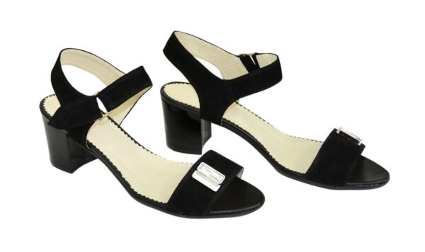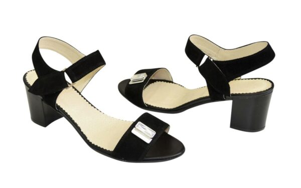 Дуже зручні жіночі босоніжки із натуральної замші чорного кольору, на стійкому підборі 6.5 см. декоровані фурнітурою. Повномірні відповідають стандартній сітці розміру. Ця модель взуття максимально комфортно сидить на нозі. Завдяки додатковій фіксації гомілкостопу їх зручно носити та долати в них тривалі дистанції. Можливий відшив у шкірі, замші різних кольорів.