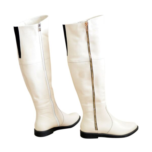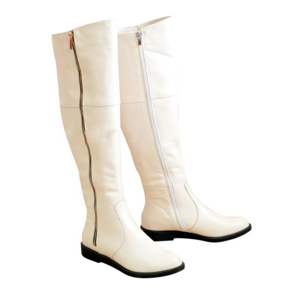 Стильні жіночі ботфорти з натуральної шкіри бежевого кольору з високою регулювальною гумкою у верхній частині чобота, на потовщеній підошві. Декоровані блискавкою. Обсяг гомілки можна замовити від 35 см до 41 см для будь-якого розміру.