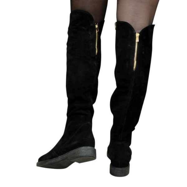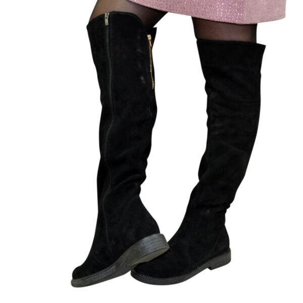 Стильні жіночі ботфорти з натуральної замші чорного кольору з регулювальним клапаном у верхній частині чобота на потовщеній підошві.