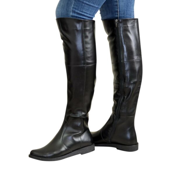 Стильні жіночі ботфорти із натуральної шкіри чорного кольору, з високою регулювальною гумкою у верхній частині чобота, на потовщеній підошві. Декоровані блискавкою. Об'єм гомілки можна замовити від 35 см. до 41 см. для будь-якого розміру.