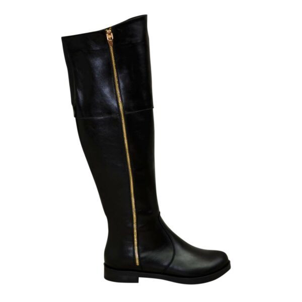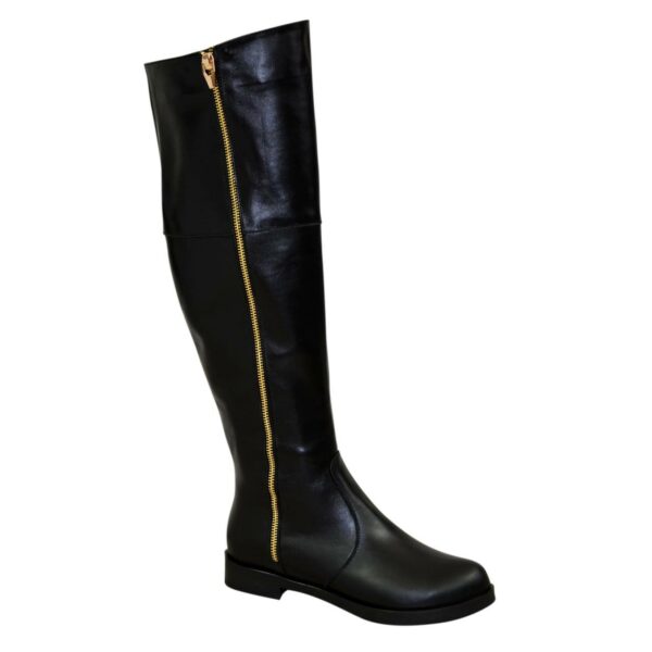 Стильні жіночі ботфорти із натурального чорного кольору, з високою регулювальною гумкою у верхній частині чобота, на потовщеній підошві. Декоровані блискавкою. Обсяг гомілки можна замовити від 35 см до 41 см для будь-якого розміру.