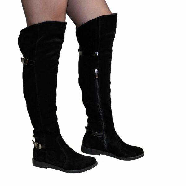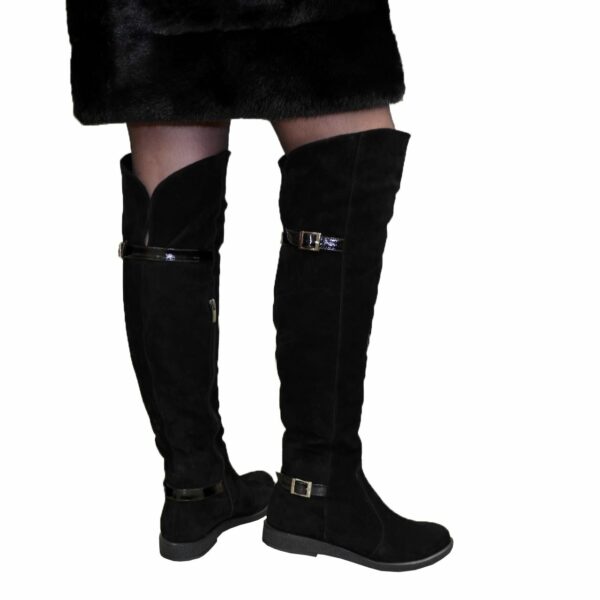 Стильні жіночі чоботи з натуральної замші чорного кольору, декоровані ремінцями з натуральної лакової шкіри чорного кольору, на потовщеній підошві. Зручна підошва на низькому ходу робить їх ідеально комфортними та практичними.