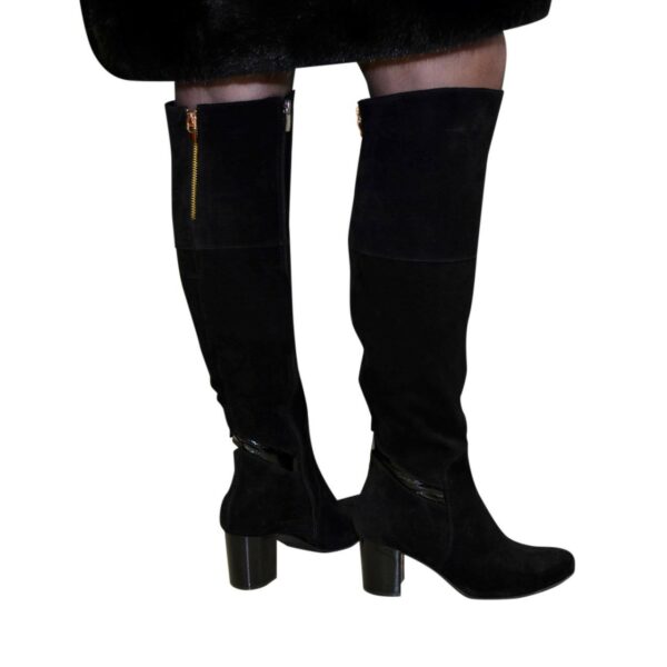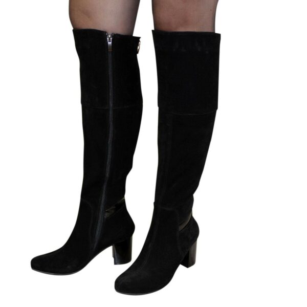 Стильні жіночі ботфорти із натуральної замші чорного кольору, з гумкою у верхній частині чобота, на стійкому підборі.