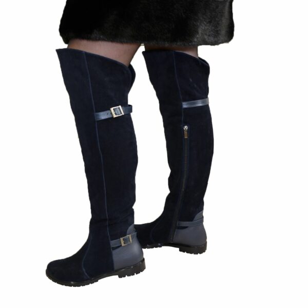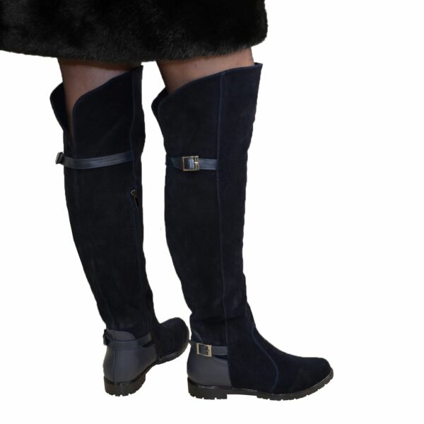 Стильні жіночі чоботи ботфорти з натуральної замші синього кольору, декоровані шкіряними вставками та ремінцями на потовщеній підошві. Зручна потовщена підошва робить їх ідеально комфортними та практичними.