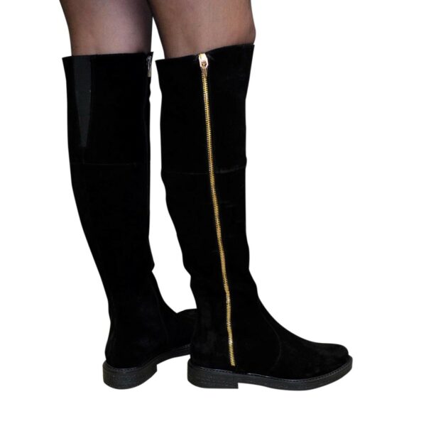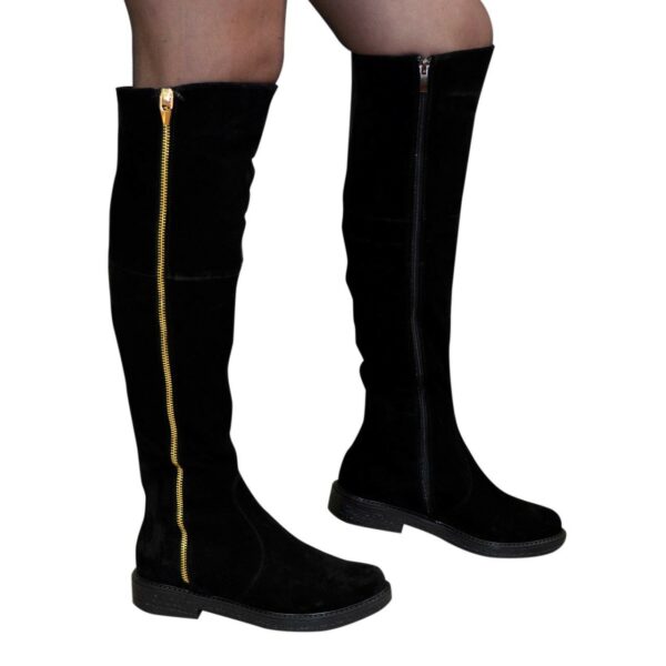 Стильні жіночі ботфорти з натуральної замші чорного кольору з високою регулювальною гумкою у верхній частині чобота, на потовщеній підошві. Декоровані блискавкою. Обсяг гомілки можна замовити від 35 см до 41 см для будь-якого розміру.