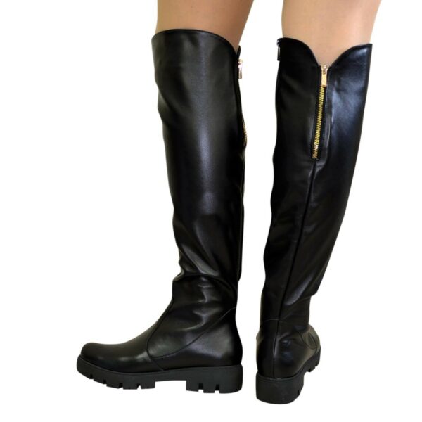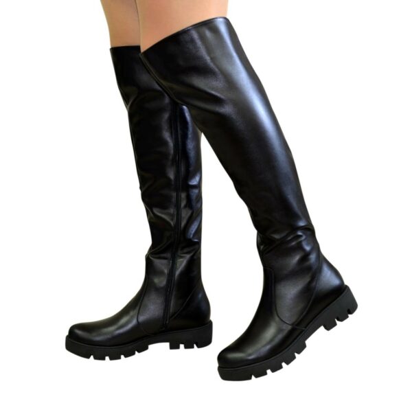 Стильні жіночі ботфорти із натуральної шкіри чорного кольору з регулювальним клапаном у верхній частині чобота, на потовщеній підошві.