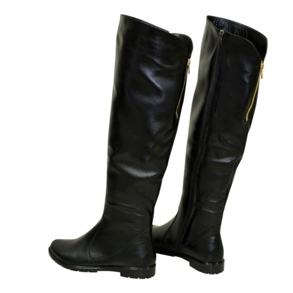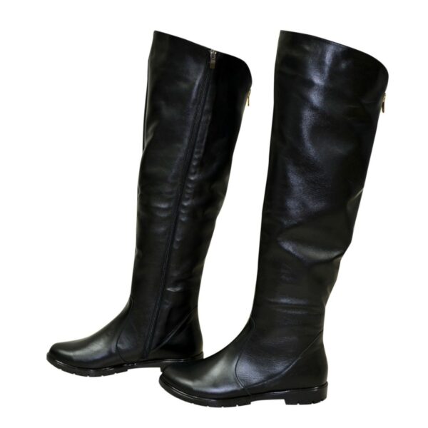 Стильні жіночі ботфорти з натуральної шкіри чорного кольору з регулювальним клапаном у верхній частині чобота на потовщеній підошві.