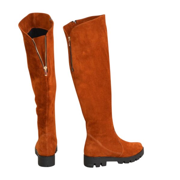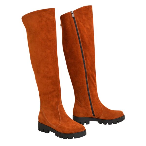 Стильні жіночі ботфорти з натуральної замші рудого кольору з регулювальним клапаном у верхній частині чобота на потовщеній підошві.