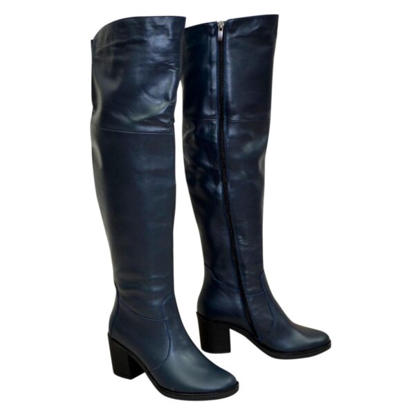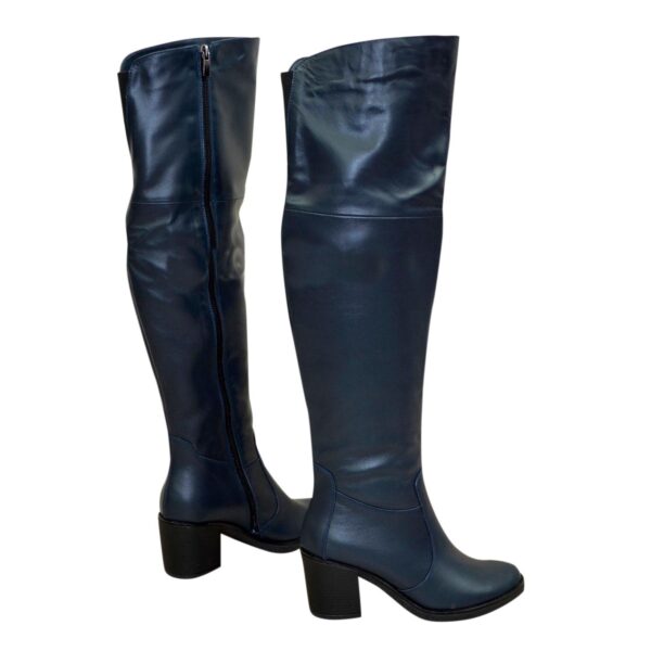 Стильні жіночі ботфорти із натуральної шкіри синього кольору, з гумкою у верхній частині чобота, на потовщеній підошві.