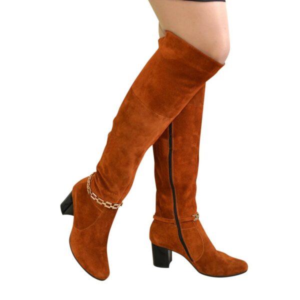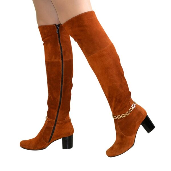 Стильні жіночі ботфорти із натуральної замші рудого кольору, з гумкою у верхній частині чобота, на потовщеній підошві. Декоровані ланцюгом. Обсяг гомілки можна замовити від 35 см до 40 см для будь-якого розміру.